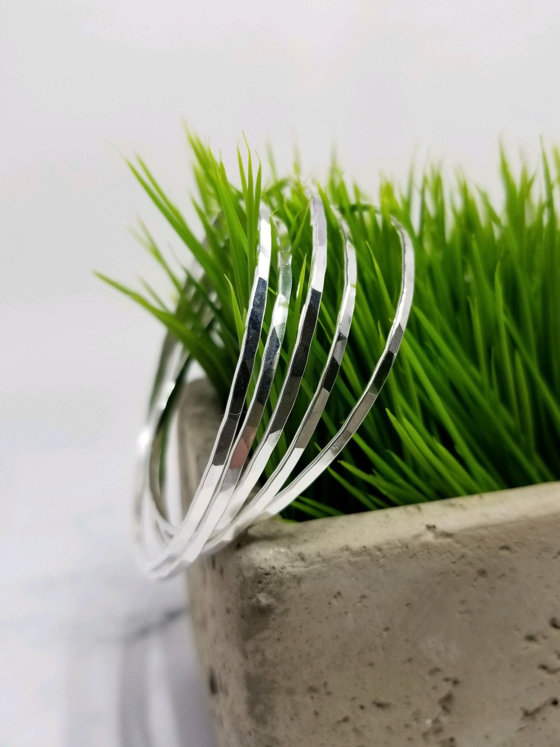 You won't want to take this skinny bangle off! I hand form, hammer, and polish this bracelet in sterling silver to make a gorgeous piece that you can wear every day. I harden it in the tumbler for several hours to make a durable bracelet that will stand the test of time. The hammered finish makes facets that catch the light and the eye! Wear one by itself for an understated look or wear them all together for a modern, layered look. Bracelet sizes are as follows: